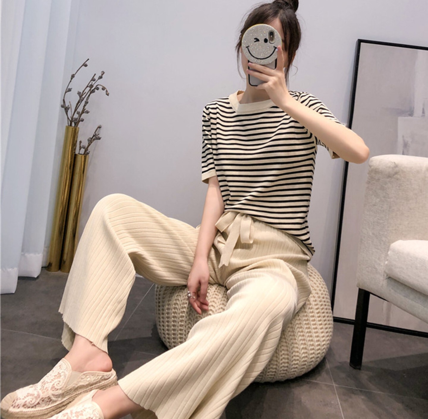 ボーダーニットと白のパンツでオシャレ見え カジュアル仕上げの白ワントーンコーデ Andgirl アンドガール